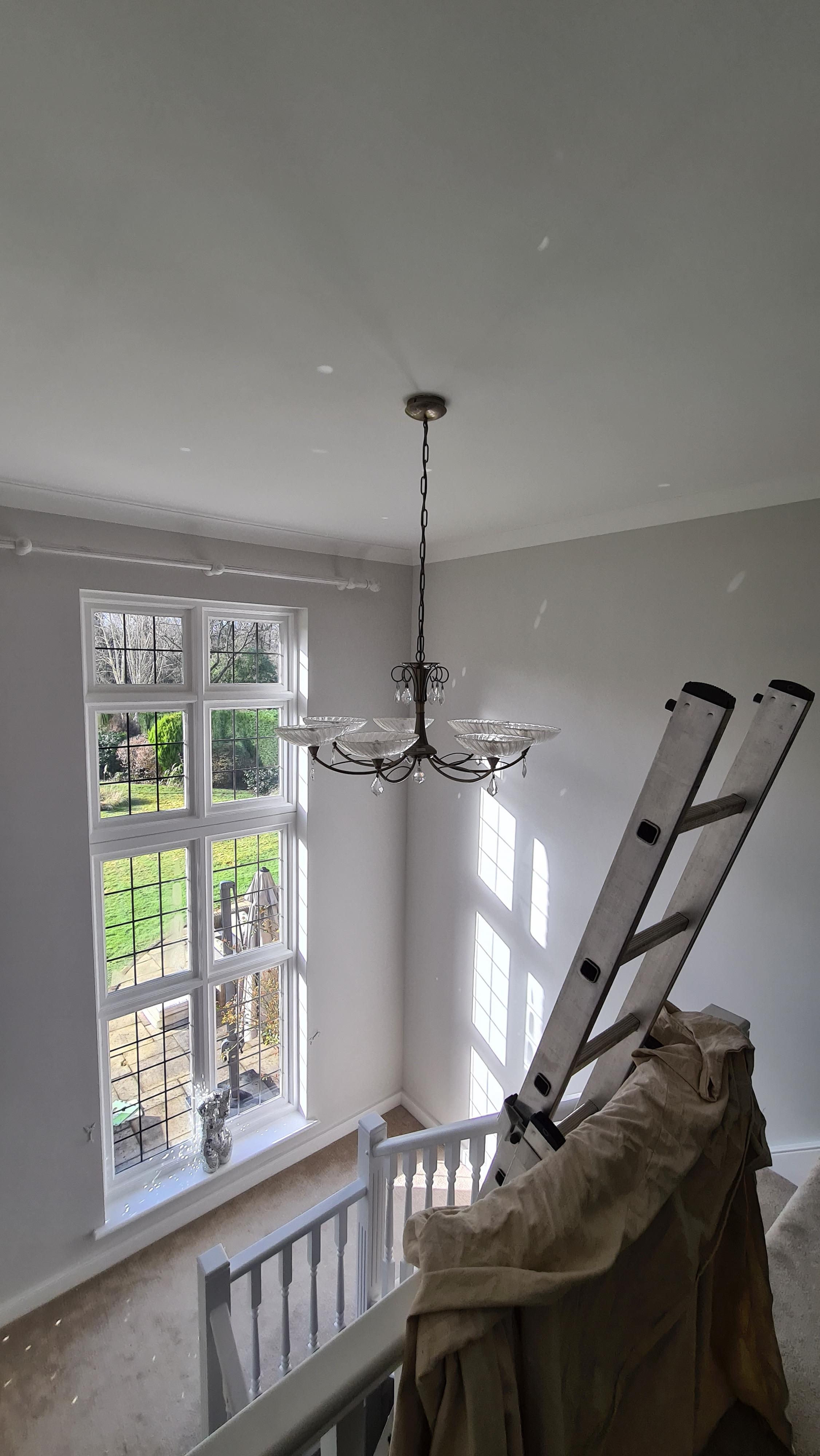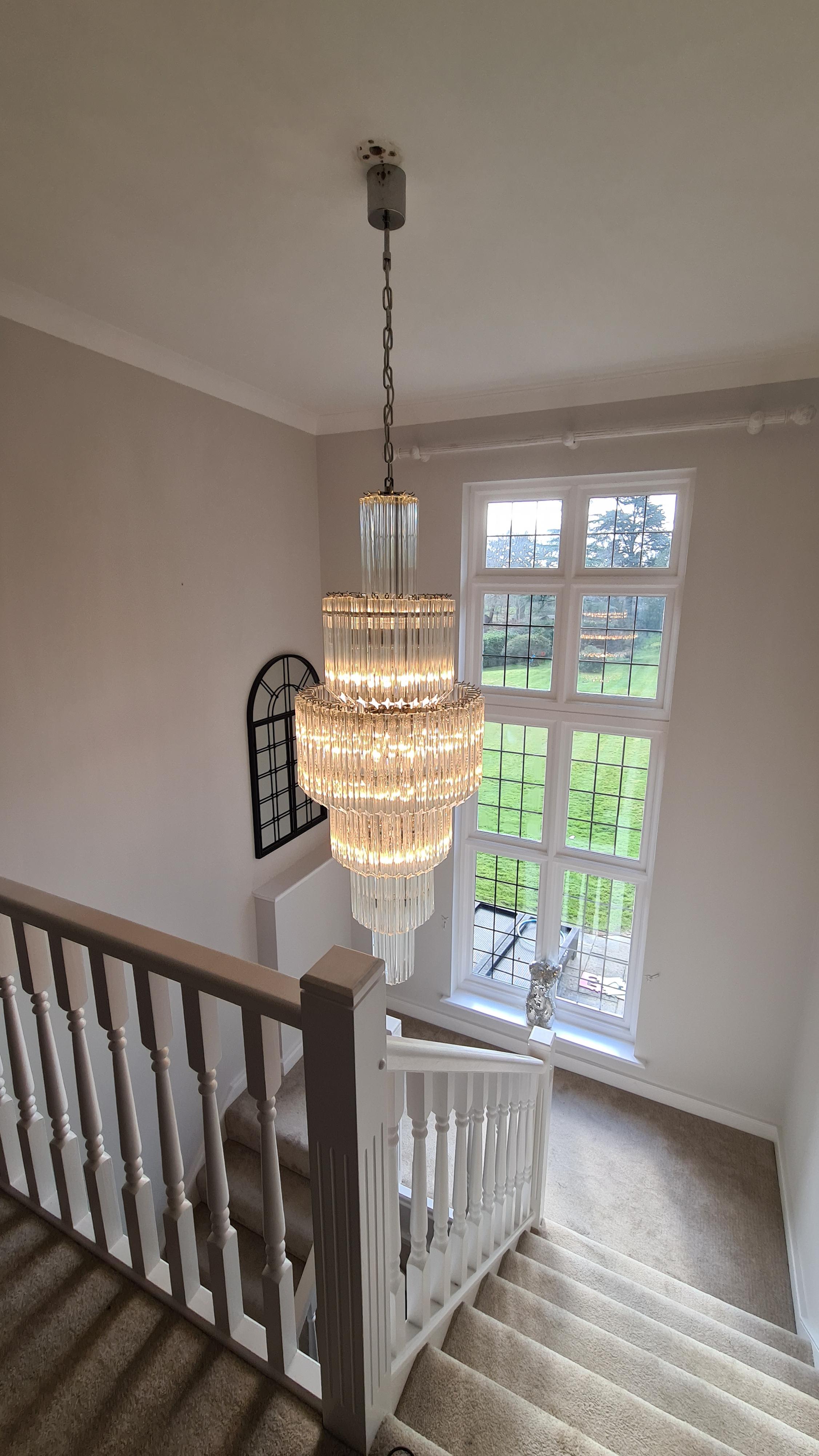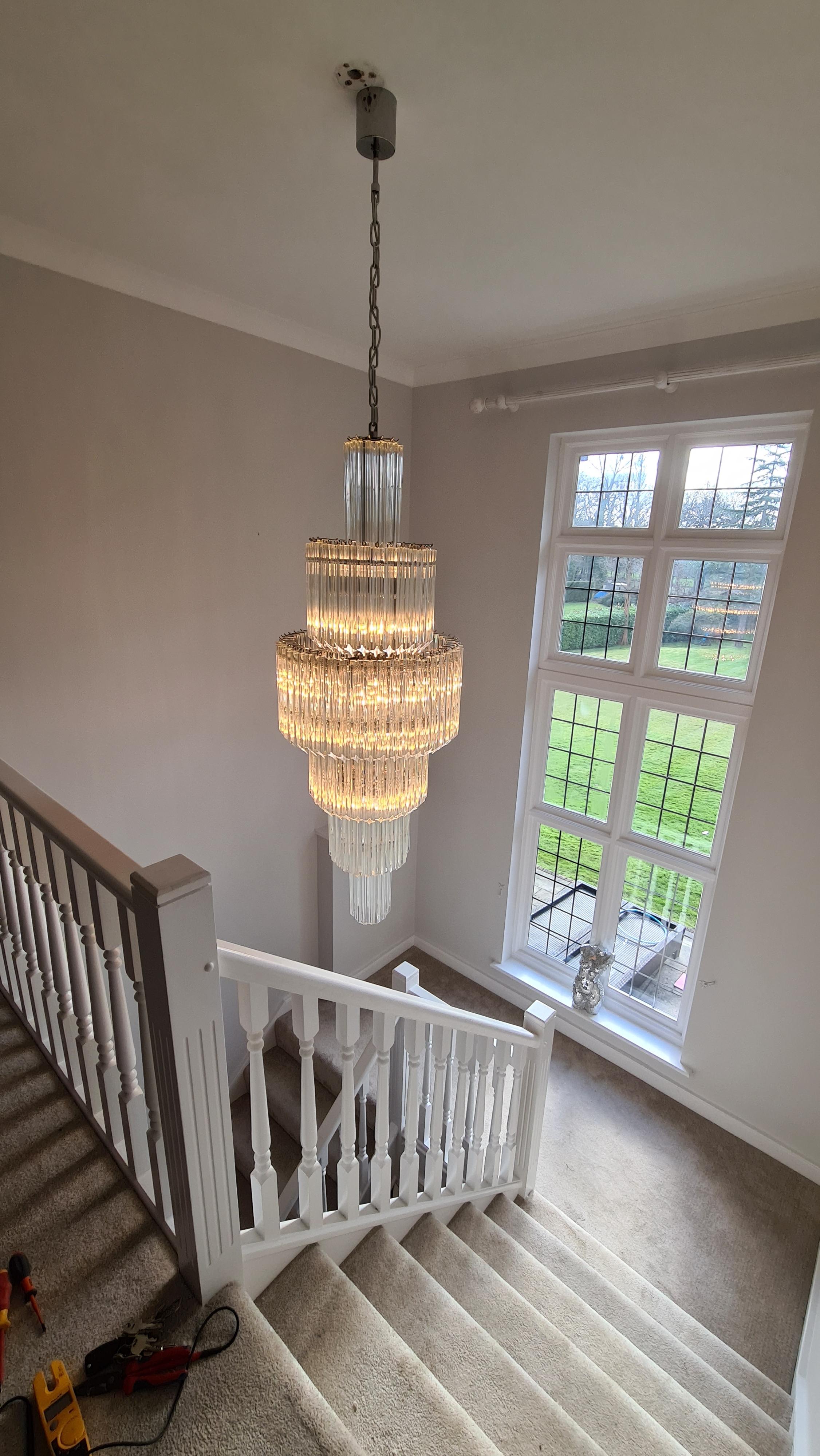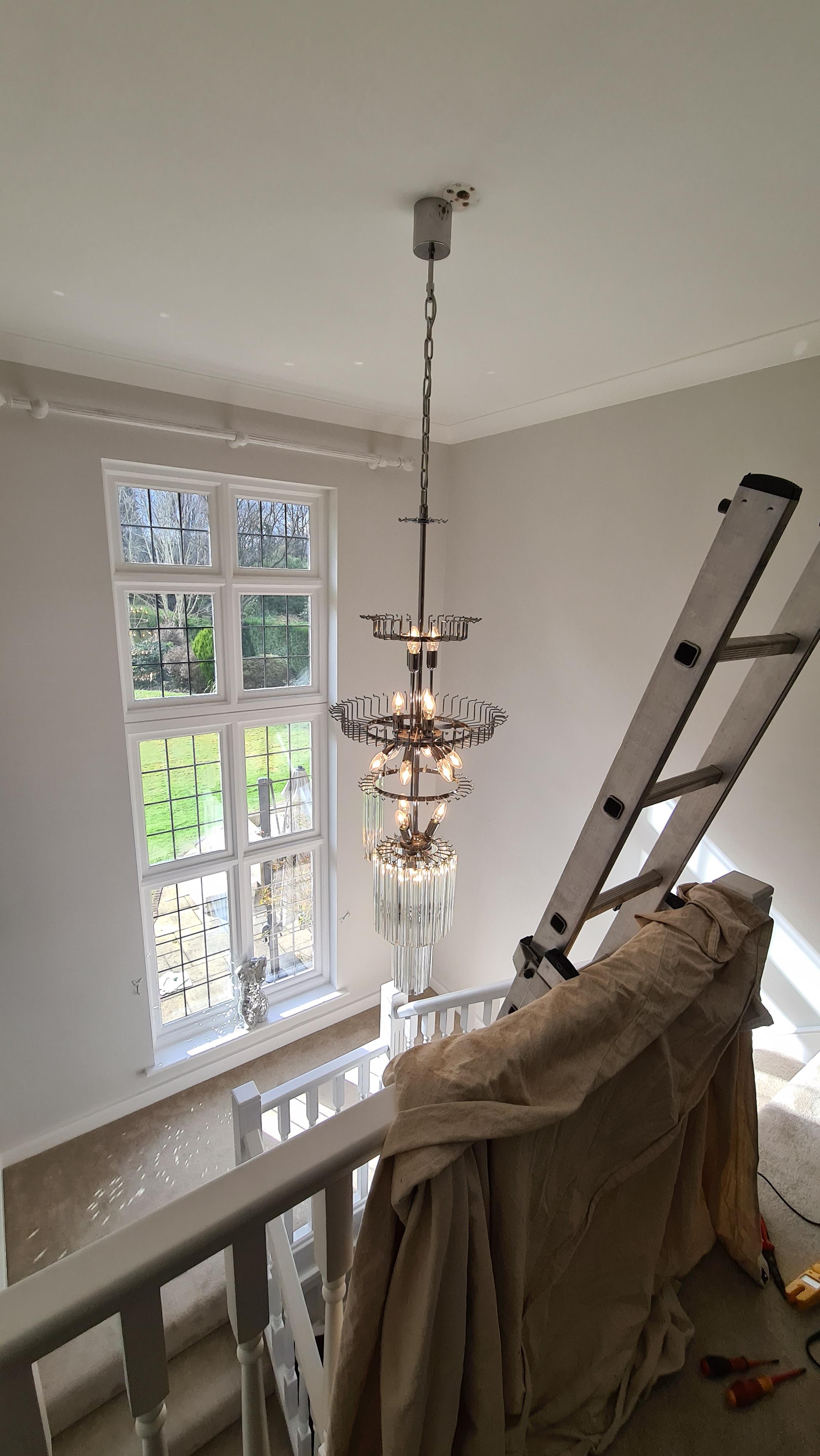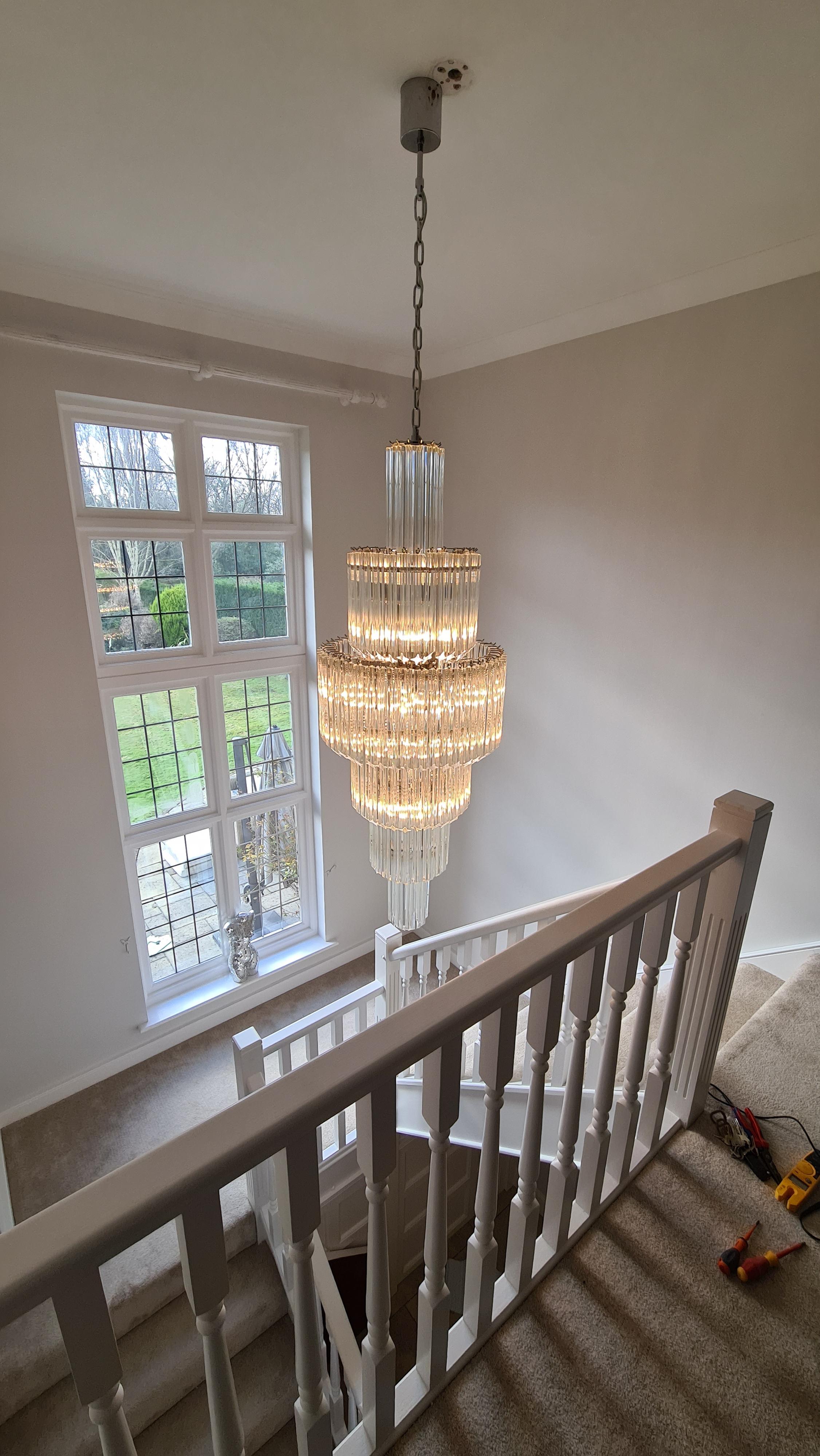Our client moved into a new property in Cobham and asked if we could install a beautiful, oversized chandelier above their staircase. As a trusted local electrician in Cobham, we were delighted to help.
