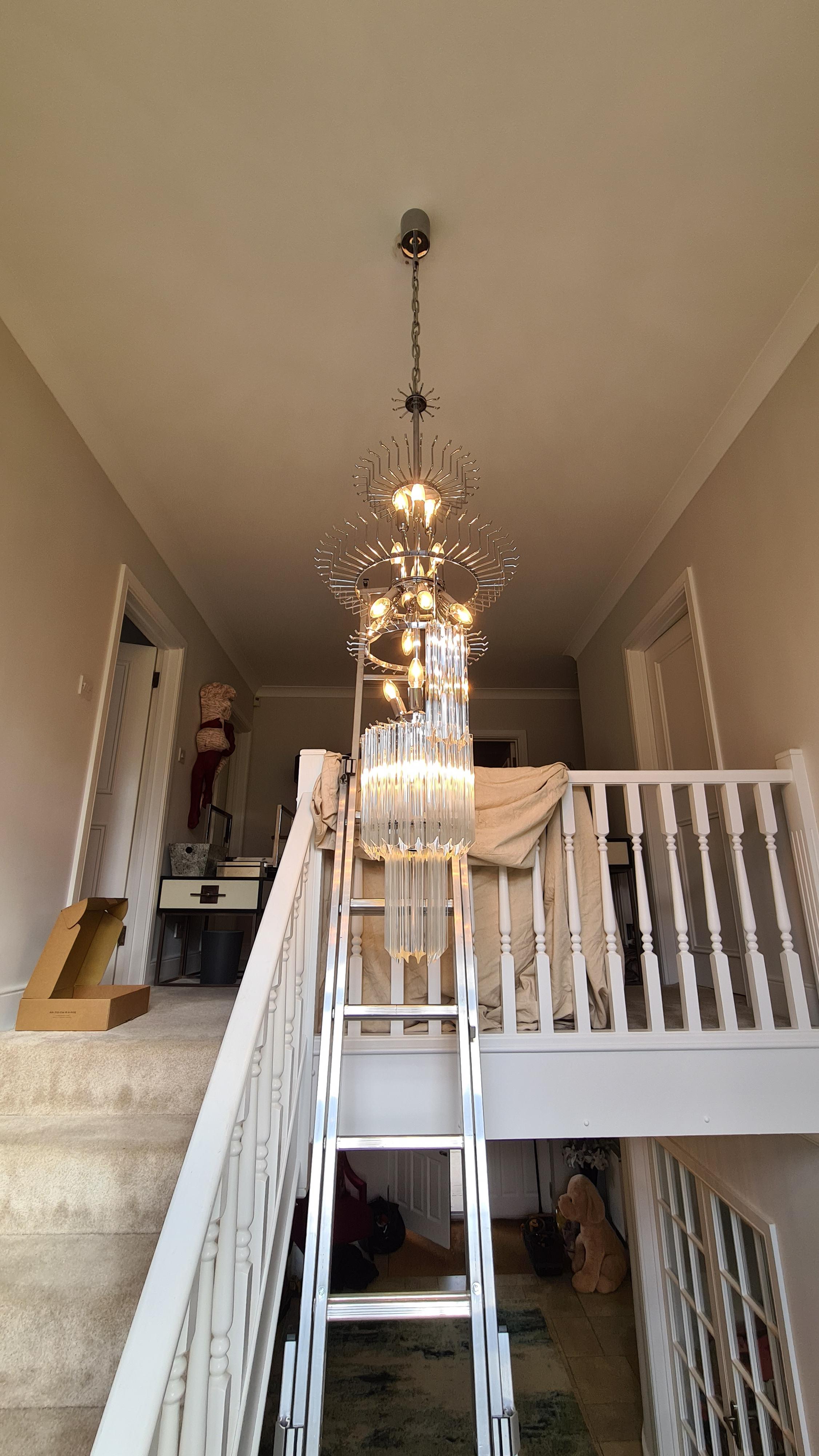 Our team safely isolated and removed the old light fitting before strengthening the ceiling from the loft to support the weight of the new chandelier. Once the bracing was in place, we carefully assembled and installed each individual glass piece by hand to create a stunning centrepiece.