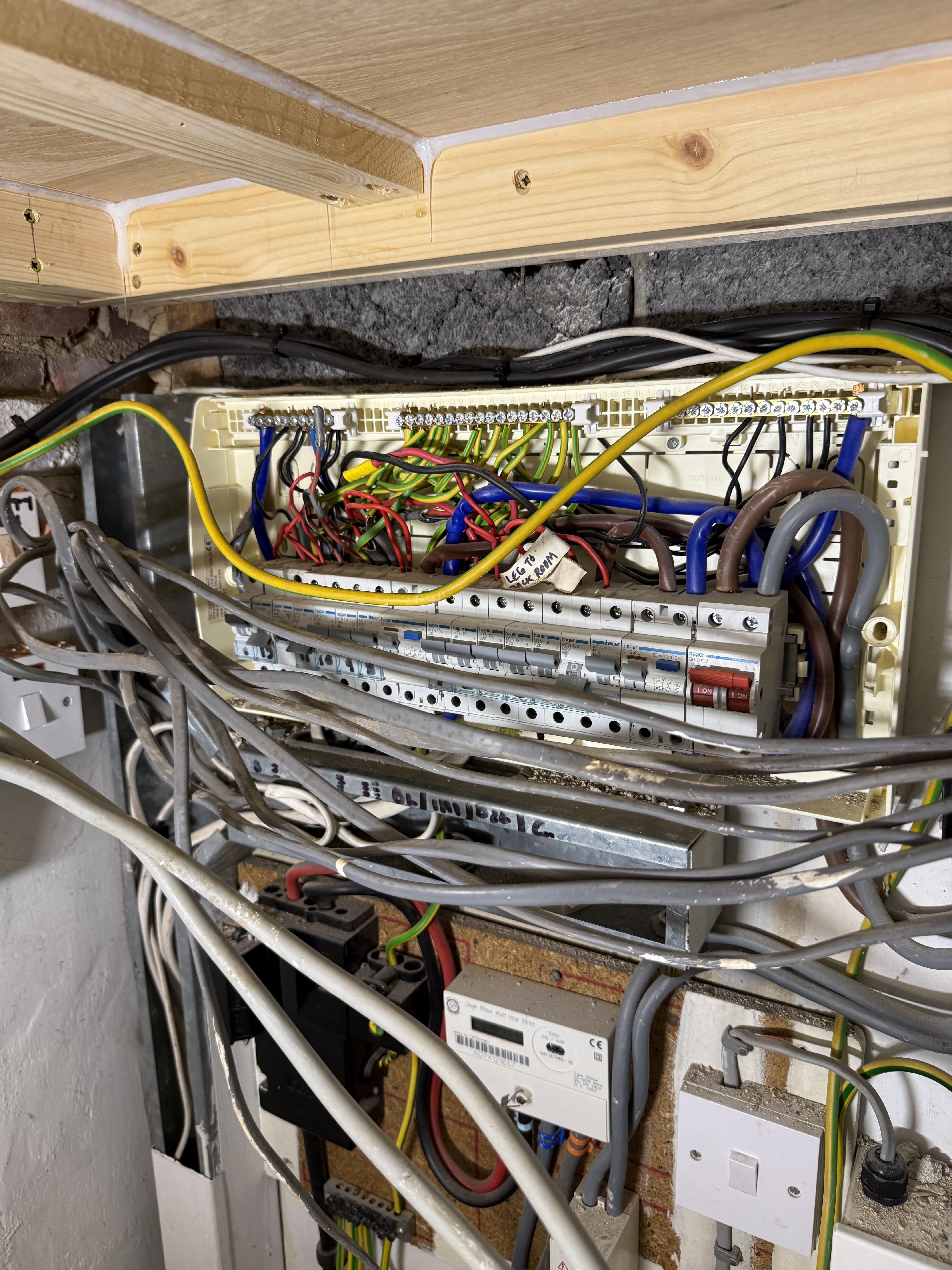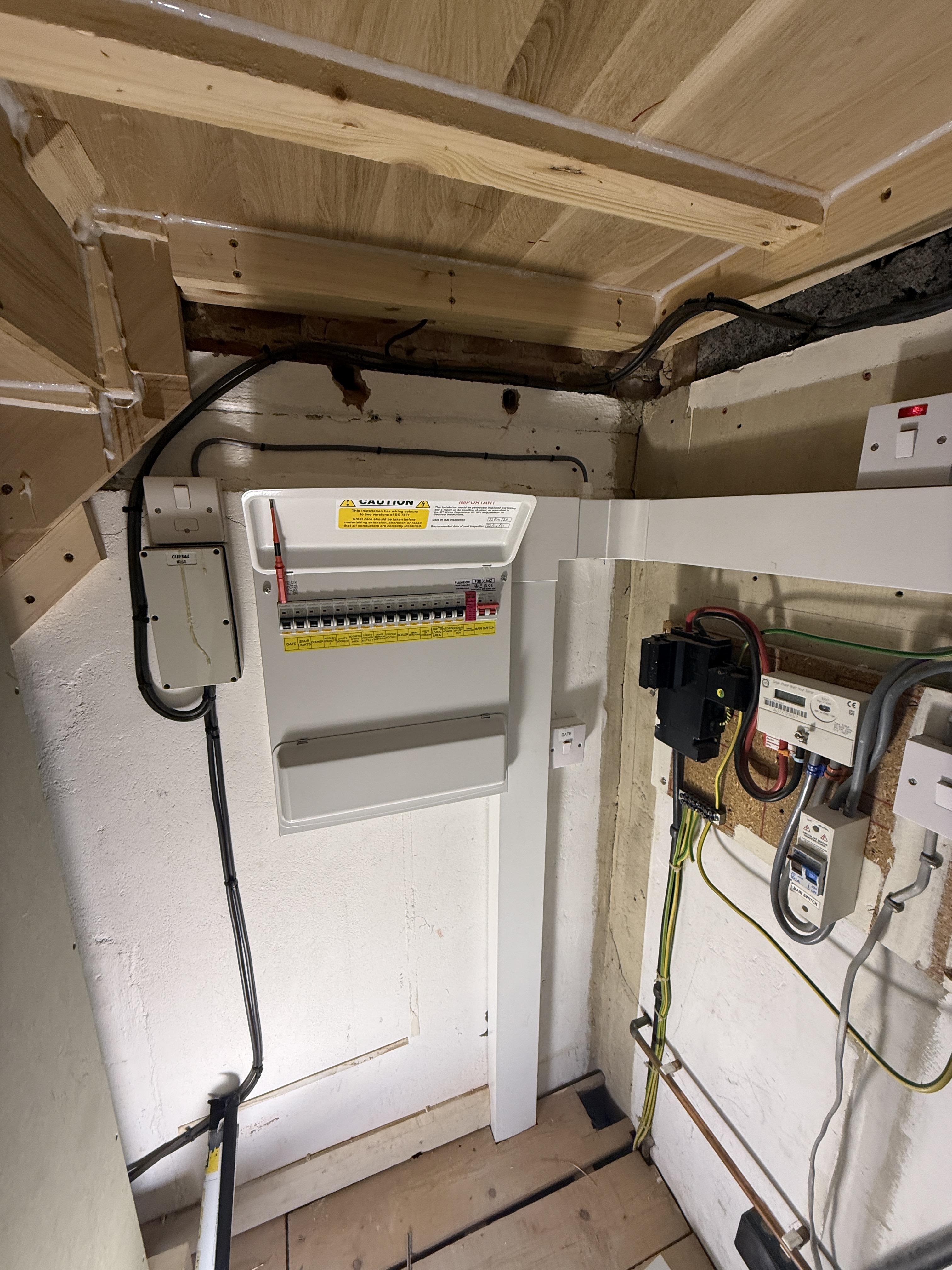 The previous installation looked cluttered and untidy, with cables poorly arranged and old equipment taking up unnecessary space. After completing the upgrade, the new consumer unit installation is clean, organised and professionally installed, making the area far safer and much easier to access in the future.
